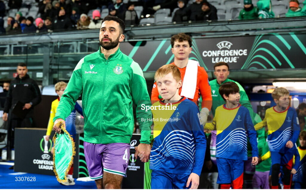 11 December 2025; Roberto Lopes of Shamrock Rovers leads his side onto the pitch before the UEFA Conference League 2025/26 league phase match between Breidablik and Shamrock Rovers at Laugardalsvöllur in Reykjavik, Iceland. Photo by Haflidi Breidfjord/Sportsfile