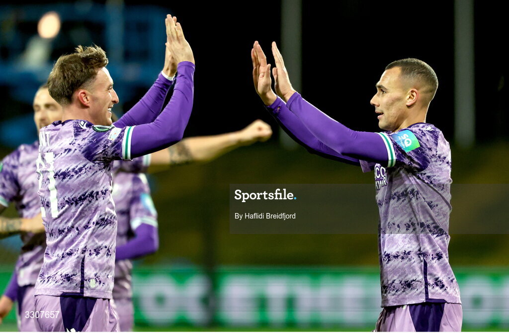 11 December 2025; Graham Burke of Shamrock Rovers, right, celebrates with teammate Danny Grant after scoring their side's first goal during the UEFA Conference League 2025/26 league phase match between Breidablik and Shamrock Rovers at Laugardalsvöllur in Reykjavik, Iceland. Photo by Haflidi Breidfjord/Sportsfile