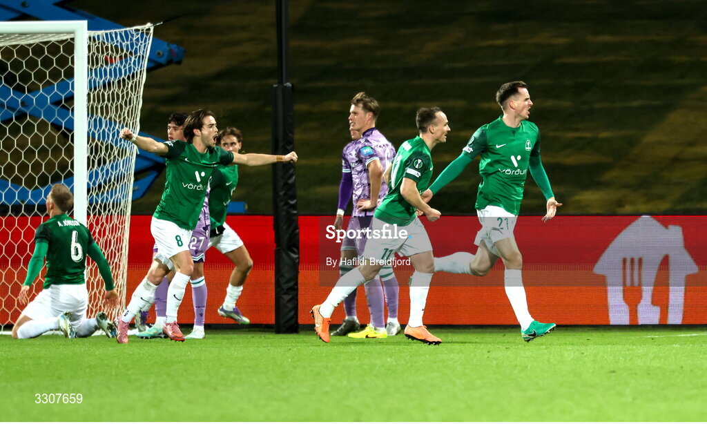 11 December 2025; Viktor Orn Margeirsson of Breidablik, right, celebrates after scoring his side's first goal during the UEFA Conference League 2025/26 league phase match between Breidablik and Shamrock Rovers at Laugardalsvöllur in Reykjavik, Iceland. Photo by Haflidi Breidfjord/Sportsfile