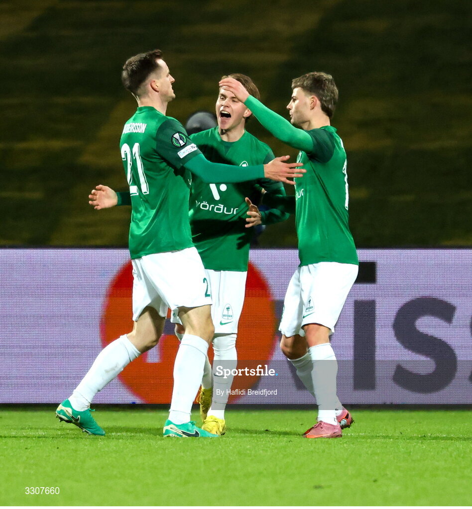 11 December 2025; Viktor Orn Margeirsson of Breidablik, left, celebrates with teammates after scoring his side's first goal during the UEFA Conference League 2025/26 league phase match between Breidablik and Shamrock Rovers at Laugardalsvöllur in Reykjavik, Iceland. Photo by Haflidi Breidfjord/Sportsfile