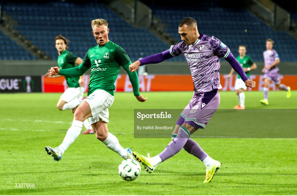 11 December 2025; Graham Burke of Shamrock Rovers in action against Arnór Gauti Jónsson of Breidablik during the UEFA Conference League 2025/26 league phase match between Breidablik and Shamrock Rovers at Laugardalsvöllur in Reykjavik, Iceland. Photo by Haflidi Breidfjord/Sportsfile