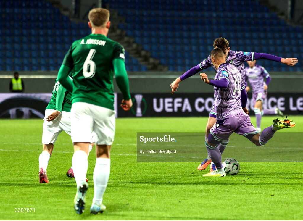 11 December 2025; Graham Burke of Shamrock Rovers shoots to score his side's first goal during the UEFA Conference League 2025/26 league phase match between Breidablik and Shamrock Rovers at Laugardalsvöllur in Reykjavik, Iceland. Photo by Haflidi Breidfjord/Sportsfile