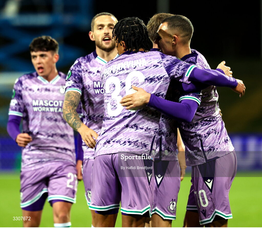11 December 2025; Graham Burke of Shamrock Rovers, right, celebrates with teammates Danny Grant, centre, and Victor Ozhianvuna after scoring their side's first goal during the UEFA Conference League 2025/26 league phase match between Breidablik and Shamrock Rovers at Laugardalsvöllur in Reykjavik, Iceland. Photo by Haflidi Breidfjord/Sportsfile
