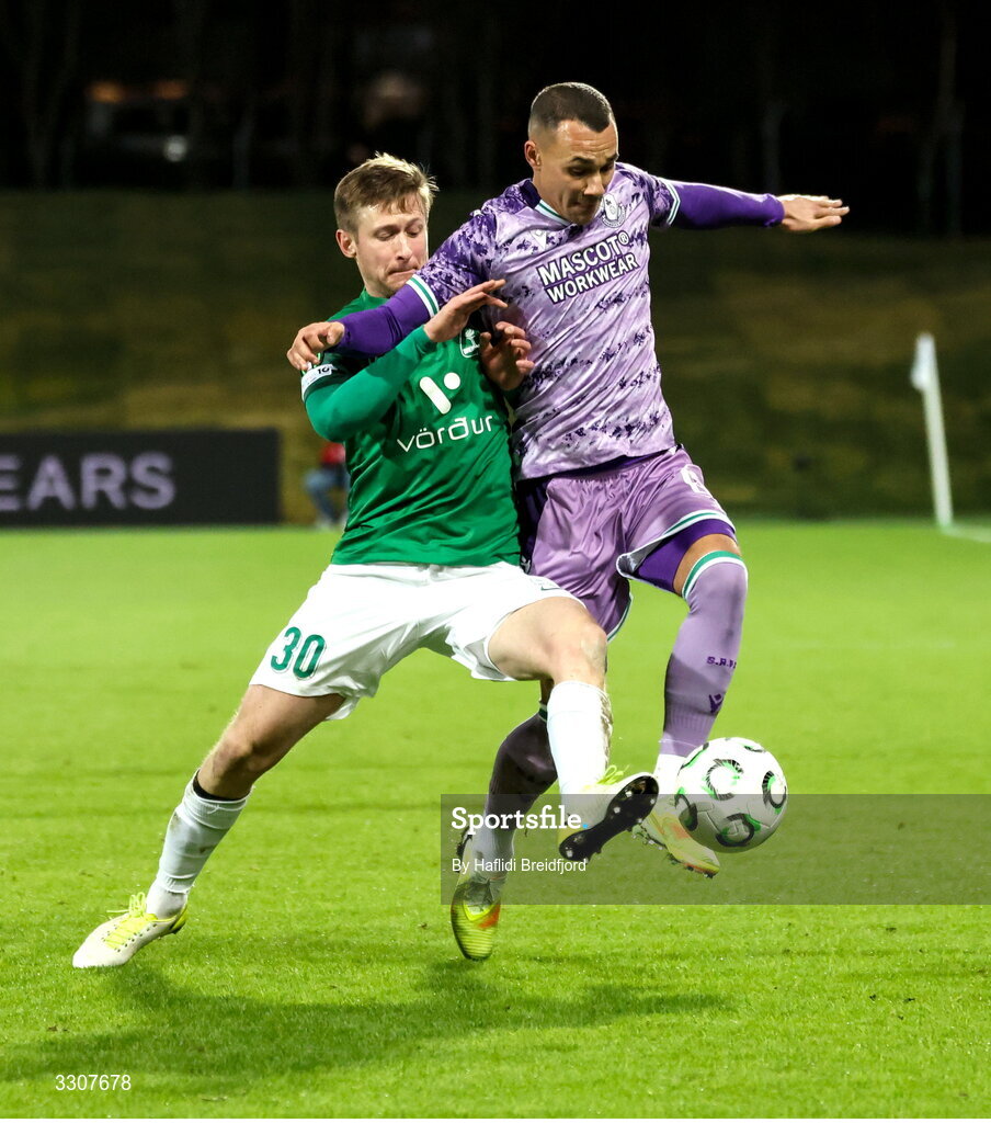 11 December 2025; Graham Burke of Shamrock Rovers in action against Andri Yeoman of Breidablik during the UEFA Conference League 2025/26 league phase match between Breidablik and Shamrock Rovers at Laugardalsvöllur in Reykjavik, Iceland. Photo by Haflidi Breidfjord/Sportsfile