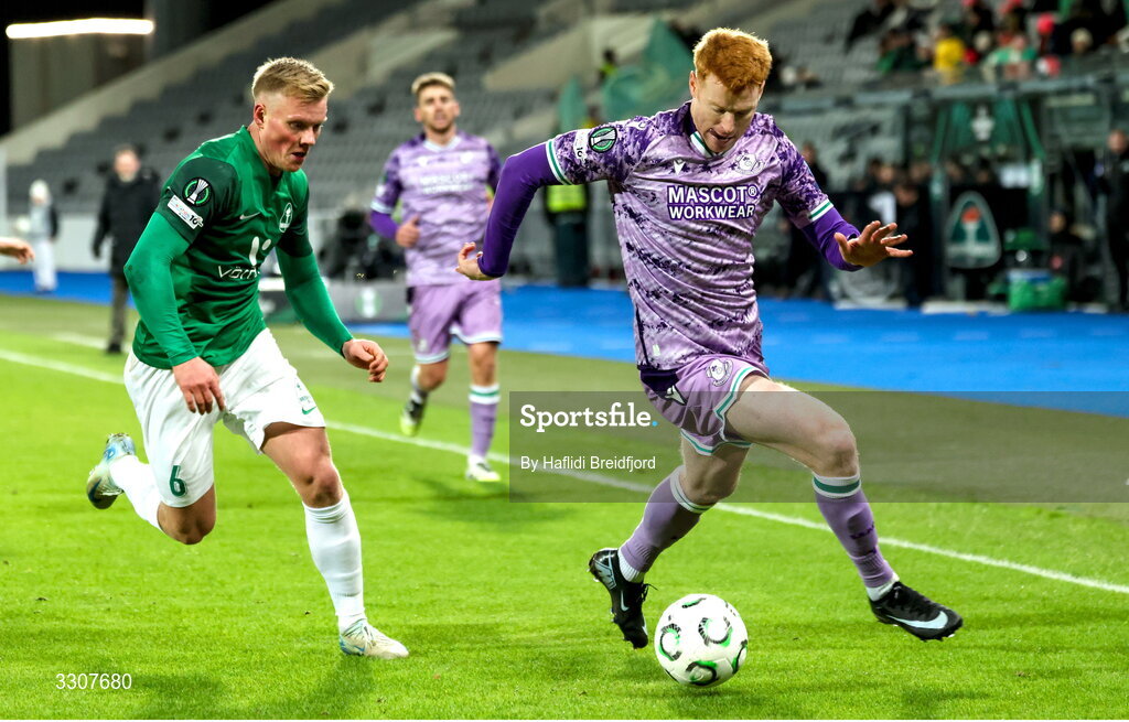 11 December 2025; Rory Gaffney of Shamrock Rovers in action against Arnór Gauti Jónsson of Breidablik during the UEFA Conference League 2025/26 league phase match between Breidablik and Shamrock Rovers at Laugardalsvöllur in Reykjavik, Iceland. Photo by Haflidi Breidfjord/Sportsfile