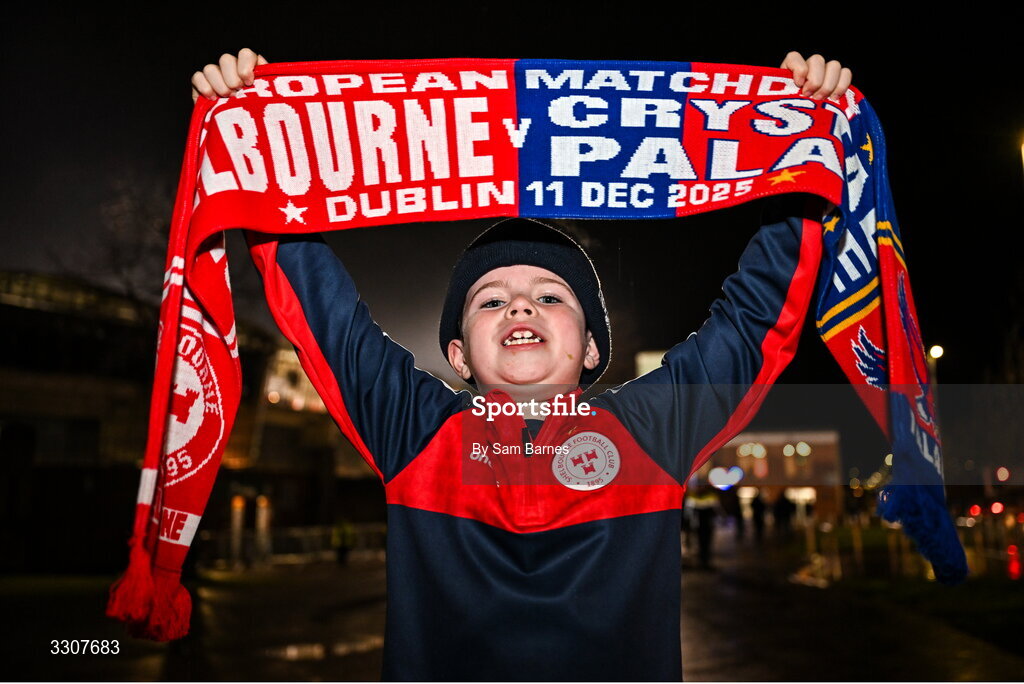 11 December 2025; Shelbourne supporter Sean Butler before the UEFA Conference League 2025/26 league phase match between Shelbourne and Crystal Palace at Tallaght Stadium in Dublin. Photo by Sam Barnes/Sportsfile