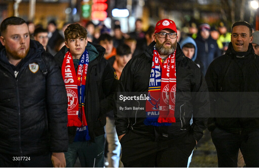 11 December 2025; Shelbourne supporters arrive before the UEFA Conference League 2025/26 league phase match between Shelbourne and Crystal Palace at Tallaght Stadium in Dublin. Photo by Sam Barnes/Sportsfile