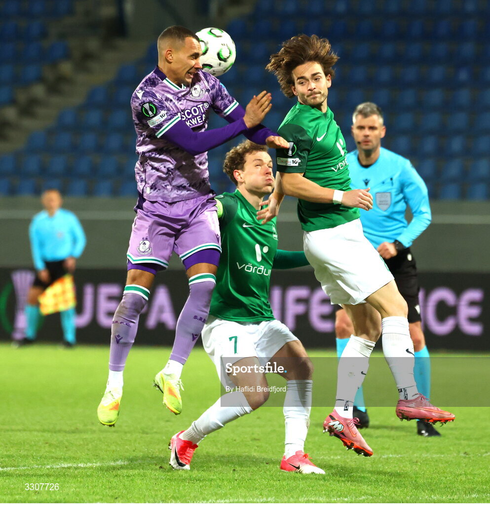11 December 2025; Graham Burke of Shamrock Rovers in action against Hoskuldur Gunnlaugsson of Breidablik, centre, during the UEFA Conference League 2025/26 league phase match between Breidablik and Shamrock Rovers at Laugardalsvöllur in Reykjavik, Iceland. Photo by Haflidi Breidfjord/Sportsfile