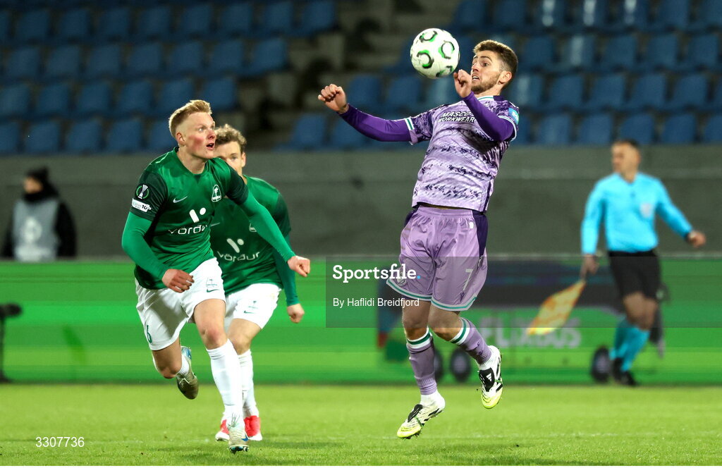 11 December 2025; Dylan Watts of Shamrock Rovers in action against Arnór Gauti Jónsson of Breidablik during the UEFA Conference League 2025/26 league phase match between Breidablik and Shamrock Rovers at Laugardalsvöllur in Reykjavik, Iceland. Photo by Haflidi Breidfjord/Sportsfile