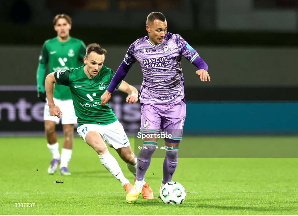 11 December 2025; Graham Burke of Shamrock Rovers in action against Aron Bjarnason of Breidablik during the UEFA Conference League 2025/26 league phase match between Breidablik and Shamrock Rovers at Laugardalsvöllur in Reykjavik, Iceland. Photo by Haflidi Breidfjord/Sportsfile