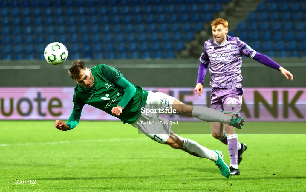 11 December 2025; Viktor Orn Margeirsson of Breidablik heads clear during the UEFA Conference League 2025/26 league phase match between Breidablik and Shamrock Rovers at Laugardalsvöllur in Reykjavik, Iceland. Photo by Haflidi Breidfjord/Sportsfile