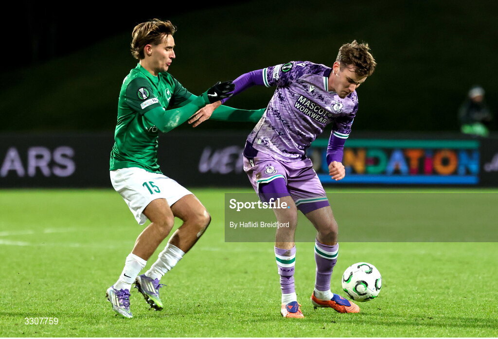 11 December 2025; Matt Healy of Shamrock Rovers in action against Agust Orri Thorsteinsson of Breidablik during the UEFA Conference League 2025/26 league phase match between Breidablik and Shamrock Rovers at Laugardalsvöllur in Reykjavik, Iceland. Photo by Haflidi Breidfjord/Sportsfile