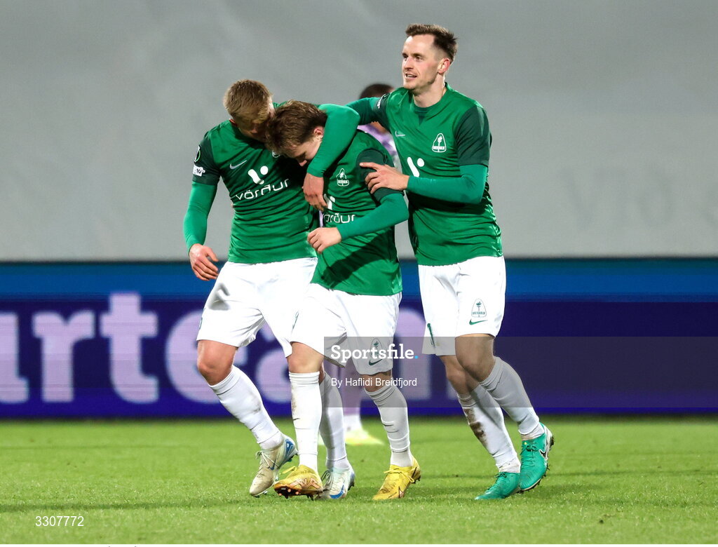 11 December 2025; Óli Valur Ómarsson of Breidablik, centre, celebrates with teammates Arnór Gauti Jónsson, left, and Viktor Orn Margeirsson after scoring their side's second goal during the UEFA Conference League 2025/26 league phase match between Breidablik and Shamrock Rovers at Laugardalsvöllur in Reykjavik, Iceland. Photo by Haflidi Breidfjord/Sportsfile
