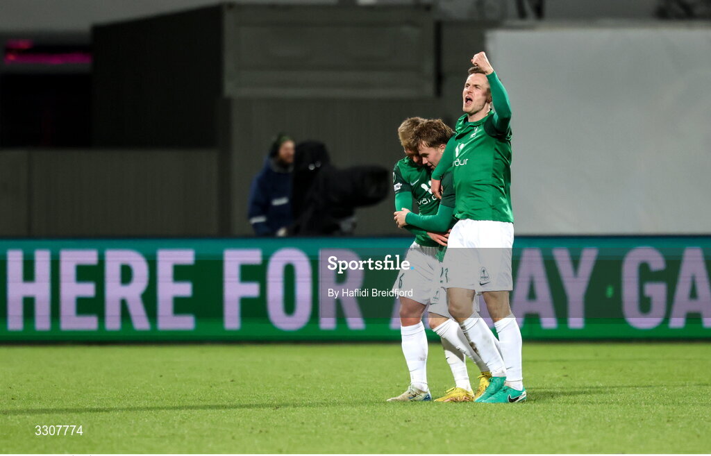 11 December 2025; Óli Valur Ómarsson of Breidablik, centre, celebrates with teammates Arnór Gauti Jónsson, left, and Viktor Orn Margeirsson after scoring their side's second goal during the UEFA Conference League 2025/26 league phase match between Breidablik and Shamrock Rovers at Laugardalsvöllur in Reykjavik, Iceland. Photo by Haflidi Breidfjord/Sportsfile