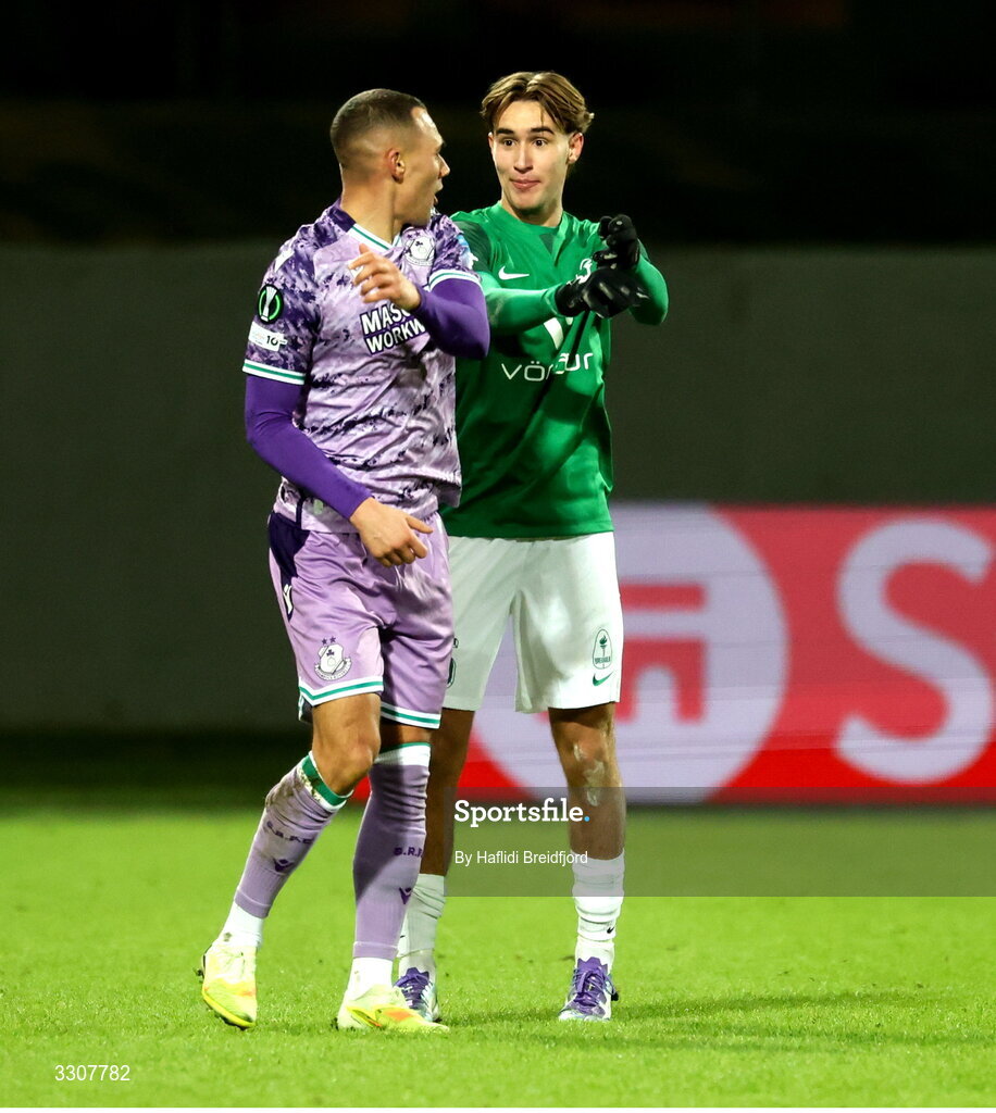 11 December 2025; Graham Burke of Shamrock Rovers tussles with Agust Orri Thorsteinsson of Breidablik during the UEFA Conference League 2025/26 league phase match between Breidablik and Shamrock Rovers at Laugardalsvöllur in Reykjavik, Iceland. Photo by Haflidi Breidfjord/Sportsfile