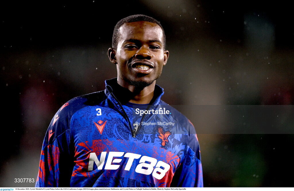11 December 2025; Tyrick Mitchell of Crystal Palace before the UEFA Conference League 2025/26 league phase match between Shelbourne and Crystal Palace at Tallaght Stadium in Dublin. Photo by Stephen McCarthy/Sportsfile