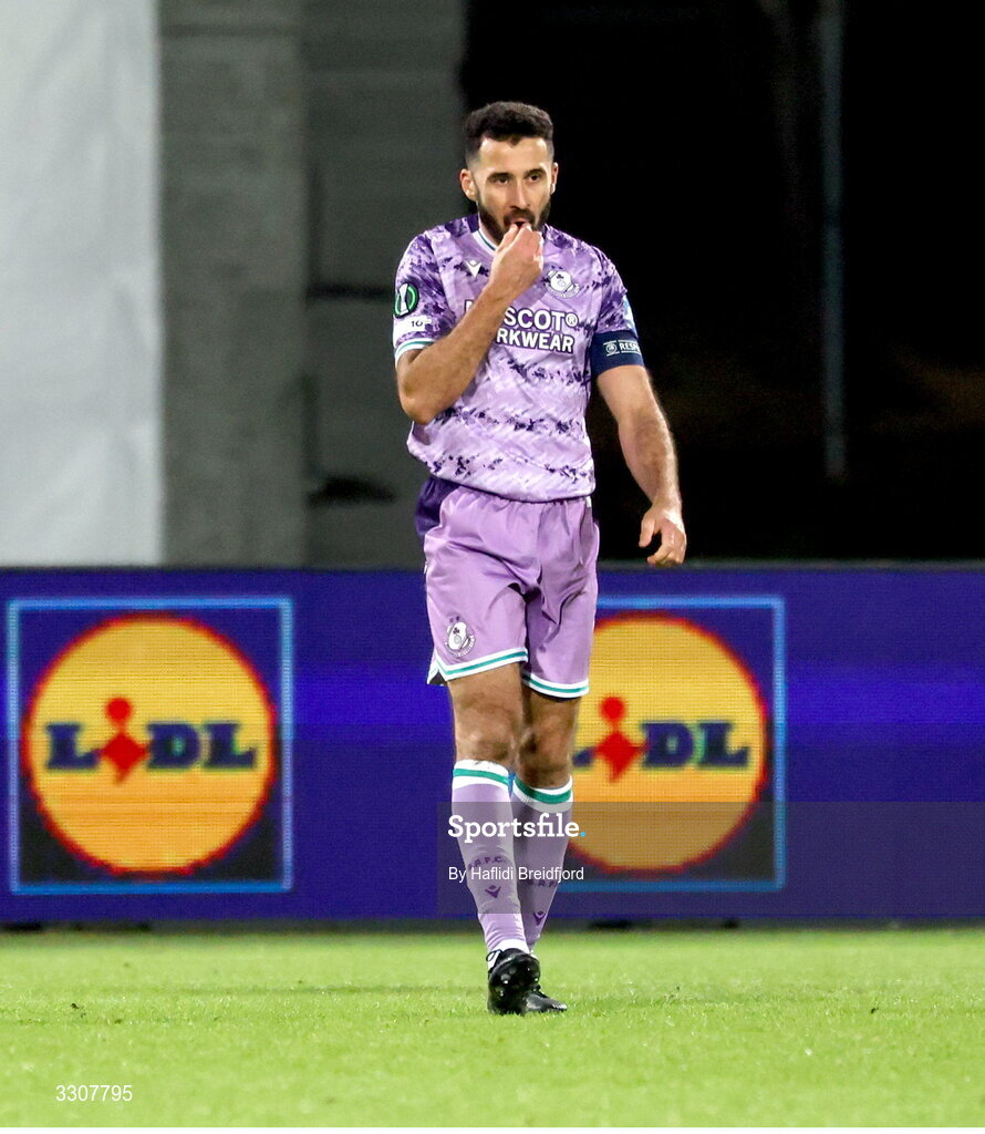 11 December 2025; Roberto Lopes of Shamrock Rovers reacts after his side conceded a third goal scored by Kristinn Jónsson of Breidablik, not pictured, during the UEFA Conference League 2025/26 league phase match between Breidablik and Shamrock Rovers at Laugardalsvöllur in Reykjavik, Iceland. Photo by Haflidi Breidfjord/Sportsfile