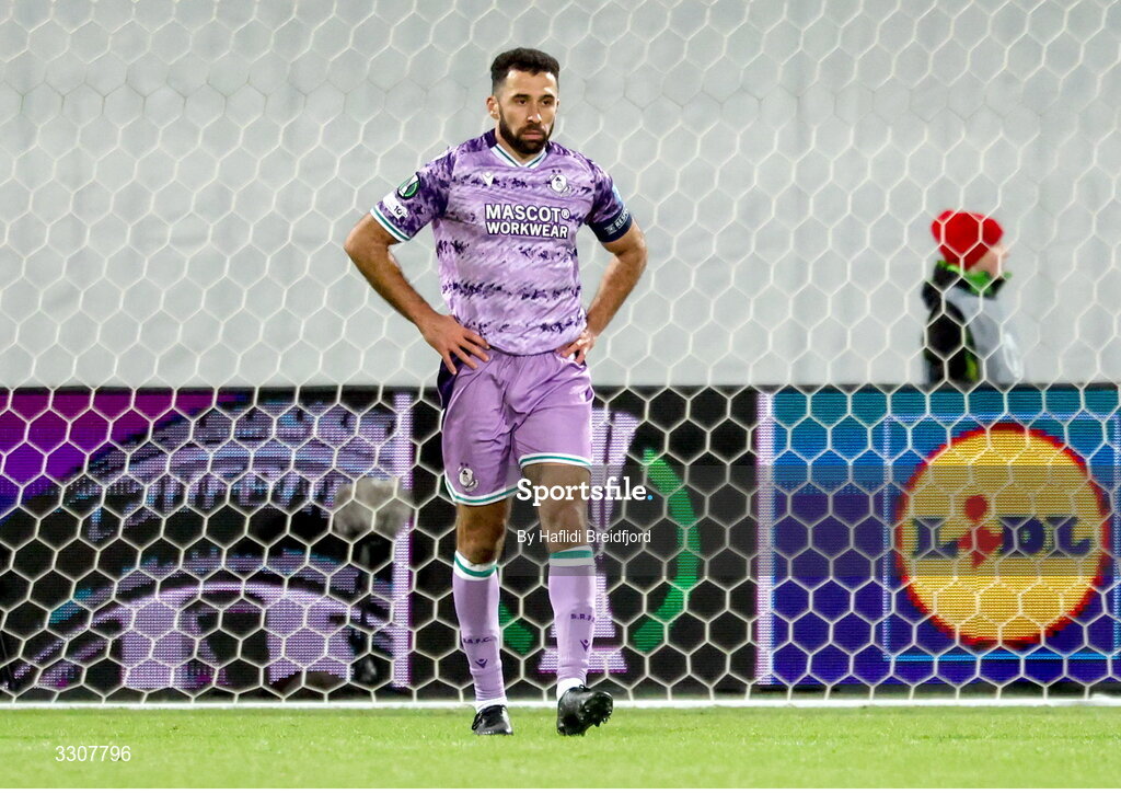 11 December 2025; Roberto Lopes of Shamrock Rovers reacts after his side conceded a third goal scored by Kristinn Jónsson of Breidablik, not pictured, during the UEFA Conference League 2025/26 league phase match between Breidablik and Shamrock Rovers at Laugardalsvöllur in Reykjavik, Iceland. Photo by Haflidi Breidfjord/Sportsfile