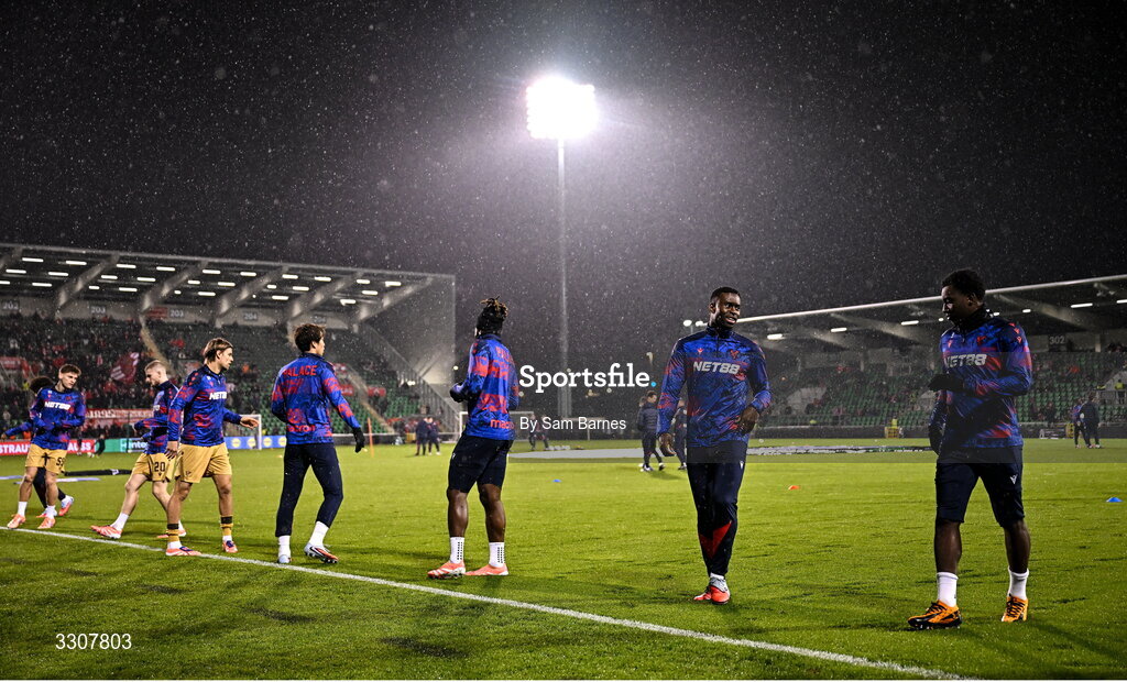 11 December 2025; Crystal Palace players warm-up before the UEFA Conference League 2025/26 league phase match between Shelbourne and Crystal Palace at Tallaght Stadium in Dublin. Photo by Sam Barnes/Sportsfile