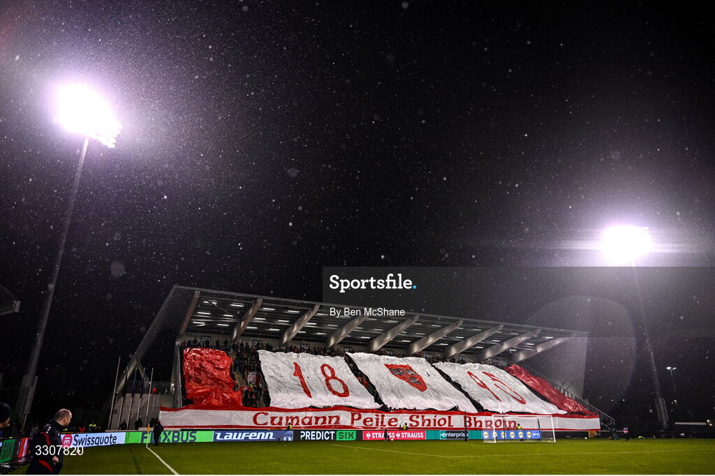 11 December 2025; Shelbourne supporters before the UEFA Conference League 2025/26 league phase match between Shelbourne and Crystal Palace at Tallaght Stadium in Dublin. Photo by Ben McShane/Sportsfile