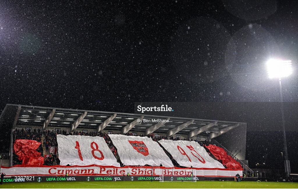 11 December 2025; Shelbourne supporters before the UEFA Conference League 2025/26 league phase match between Shelbourne and Crystal Palace at Tallaght Stadium in Dublin. Photo by Ben McShane/Sportsfile