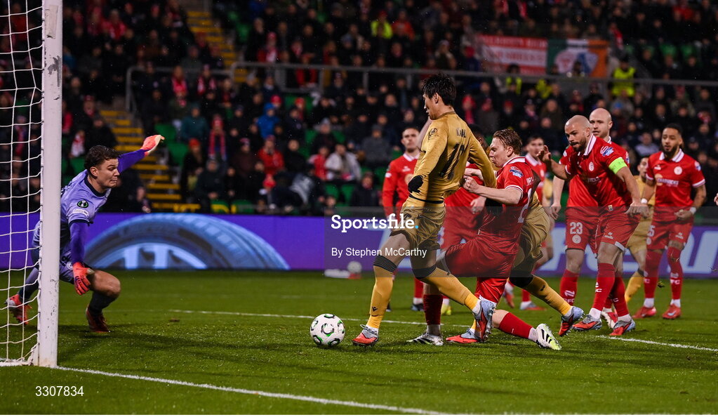 11 December 2025; Daichi Kamada of Crystal Palace shoots on goal during the UEFA Conference League 2025/26 league phase match between Shelbourne and Crystal Palace at Tallaght Stadium in Dublin. Photo by Stephen McCarthy/Sportsfile