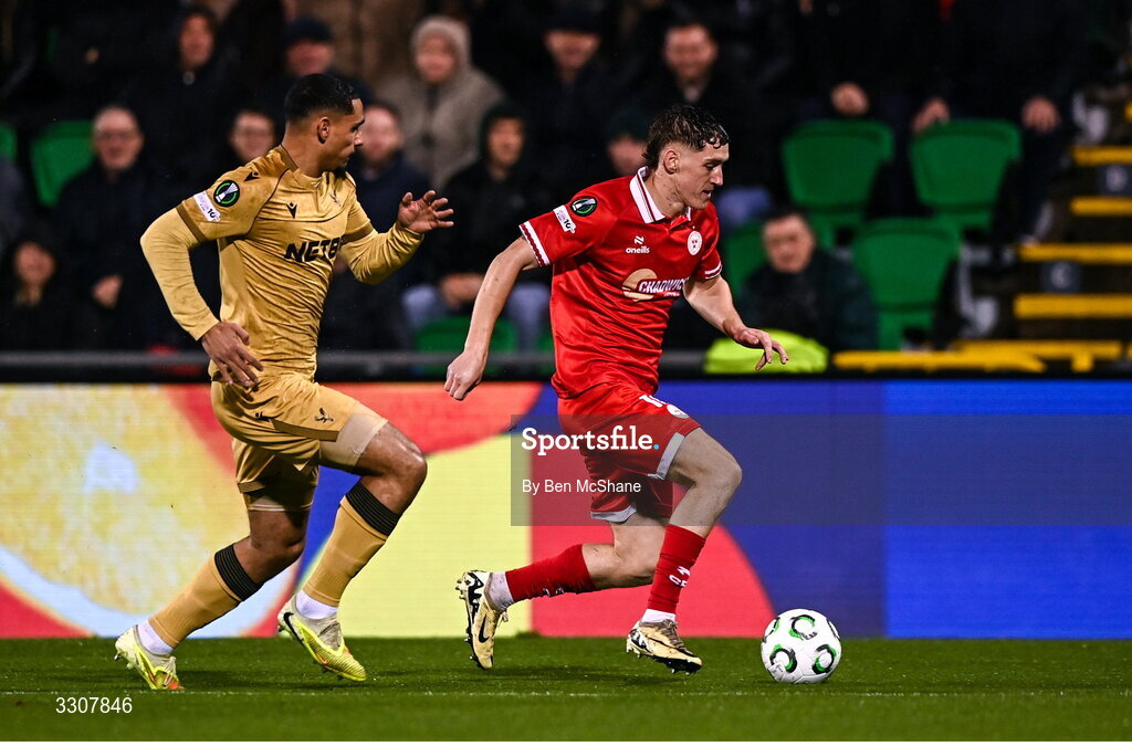 11 December 2025; John Martin of Shelbourne in action against Maxence Lacroix of Crystal Palace during the UEFA Conference League 2025/26 league phase match between Shelbourne and Crystal Palace at Tallaght Stadium in Dublin. Photo by Ben McShane/Sportsfile
