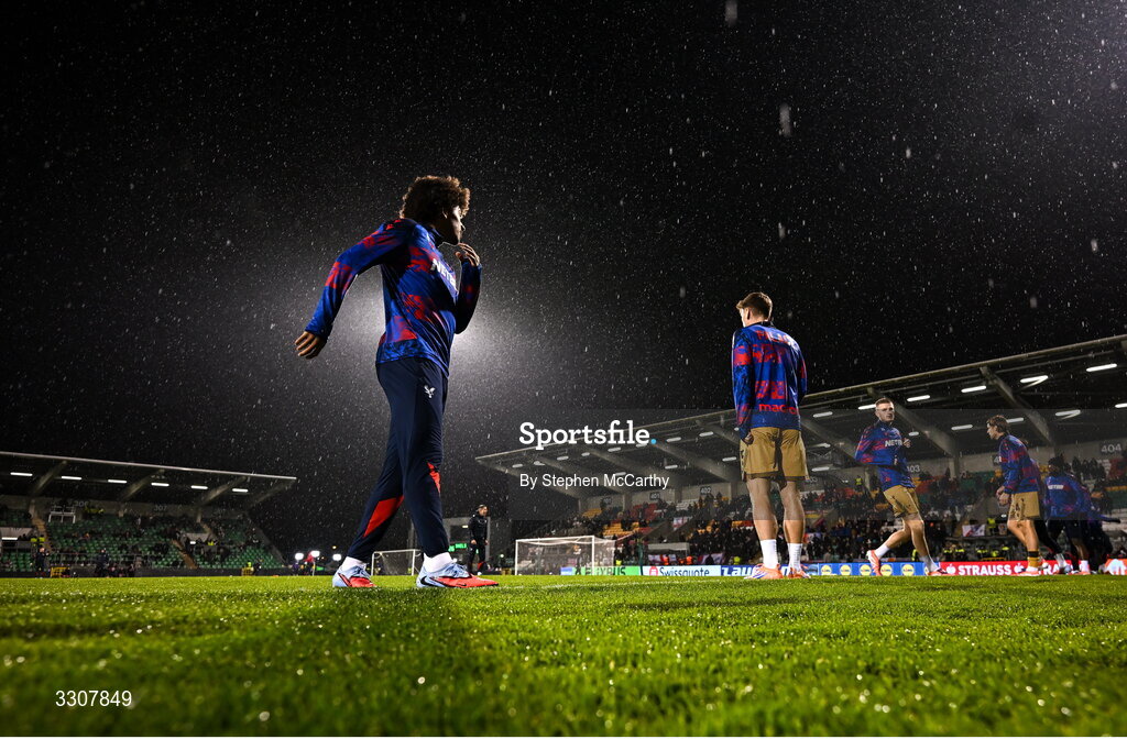 11 December 2025; Crystal Palace players warm-up before the UEFA Conference League 2025/26 league phase match between Shelbourne and Crystal Palace at Tallaght Stadium in Dublin. Photo by Stephen McCarthy/Sportsfile