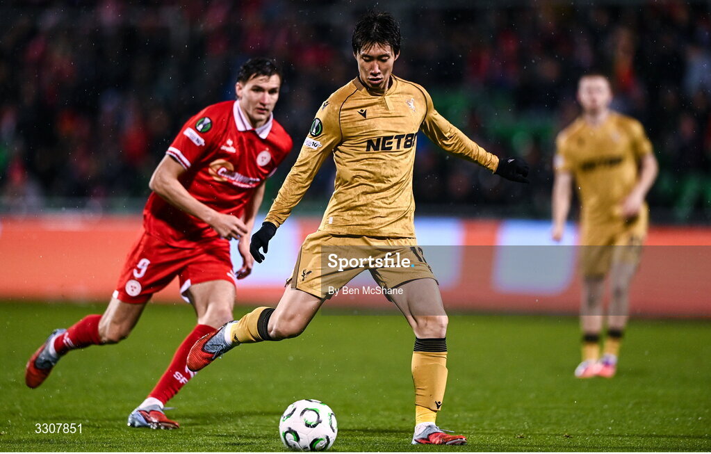 11 December 2025; Daichi Kamada of Crystal Palace in action against Sean Boyd of Shelbourne during the UEFA Conference League 2025/26 league phase match between Shelbourne and Crystal Palace at Tallaght Stadium in Dublin. Photo by Ben McShane/Sportsfile