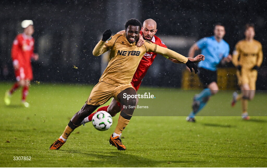 11 December 2025; Eddie Nketiah of Crystal Palace in action against Mark Coyle of Shelbourne during the UEFA Conference League 2025/26 league phase match between Shelbourne and Crystal Palace at Tallaght Stadium in Dublin. Photo by Sam Barnes/Sportsfile