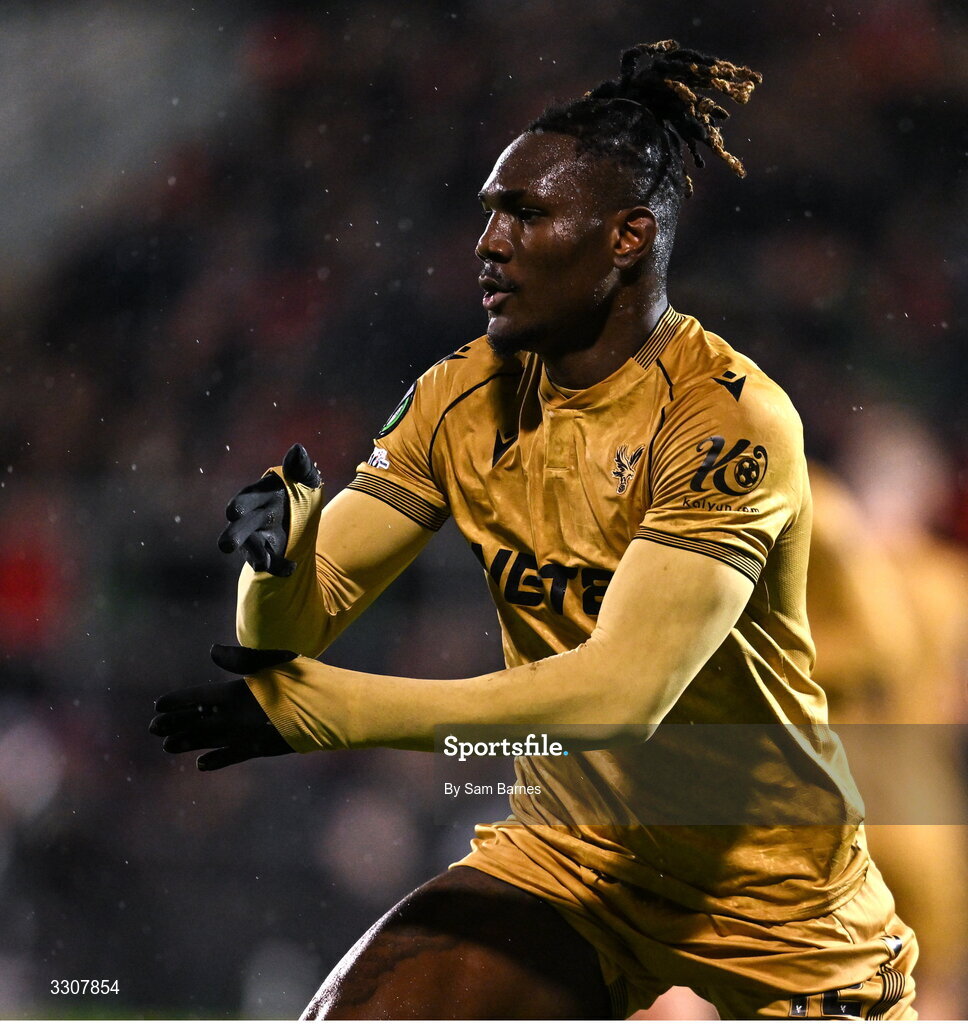 11 December 2025; Christantus Uche of Crystal Palace celebrates after scoring his side's first goal during the UEFA Conference League 2025/26 league phase match between Shelbourne and Crystal Palace at Tallaght Stadium in Dublin. Photo by Sam Barnes/Sportsfile