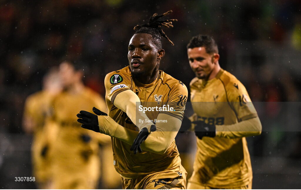 11 December 2025; Christantus Uche of Crystal Palace celebrates after scoring his side's first goal during the UEFA Conference League 2025/26 league phase match between Shelbourne and Crystal Palace at Tallaght Stadium in Dublin. Photo by Sam Barnes/Sportsfile