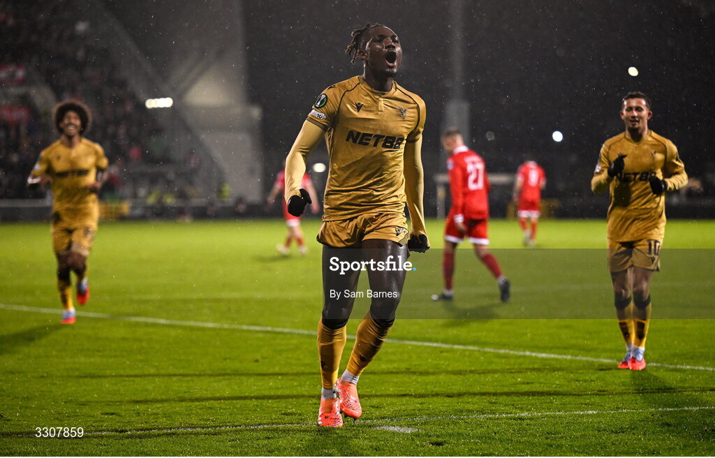 11 December 2025; Christantus Uche of Crystal Palace celebrates after scoring his side's first goal during the UEFA Conference League 2025/26 league phase match between Shelbourne and Crystal Palace at Tallaght Stadium in Dublin. Photo by Sam Barnes/Sportsfile