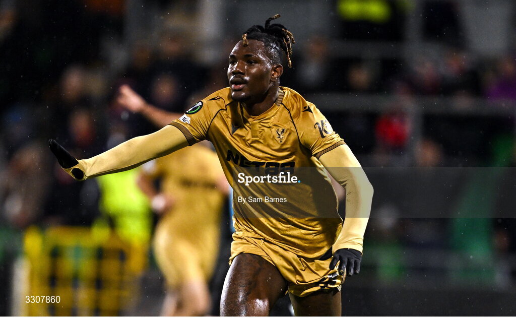 11 December 2025; Christantus Uche of Crystal Palace celebrates after scoring his side's first goal during the UEFA Conference League 2025/26 league phase match between Shelbourne and Crystal Palace at Tallaght Stadium in Dublin. Photo by Sam Barnes/Sportsfile