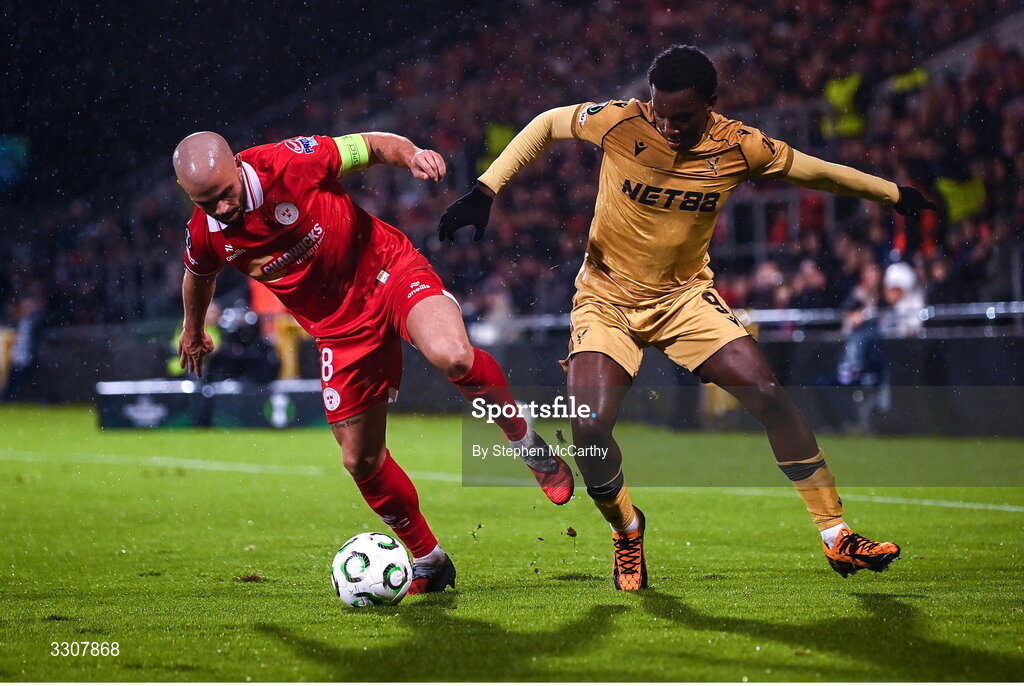 11 December 2025; Mark Coyle of Shelbourne in action against Eddie Nketiah of Crystal Palace during the UEFA Conference League 2025/26 league phase match between Shelbourne and Crystal Palace at Tallaght Stadium in Dublin. Photo by Stephen McCarthy/Sportsfile
