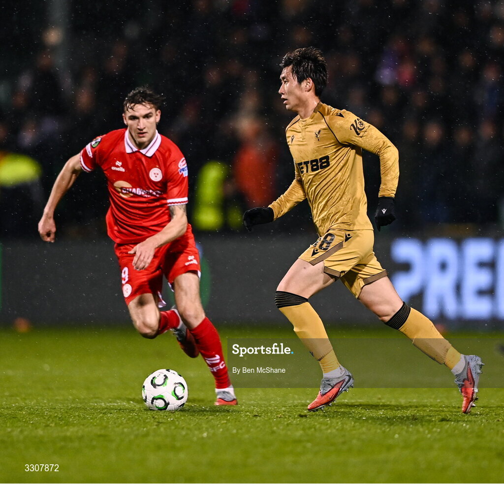 11 December 2025; Daichi Kamada of Crystal Palace in action against Sean Boyd of Shelbourne during the UEFA Conference League 2025/26 league phase match between Shelbourne and Crystal Palace at Tallaght Stadium in Dublin. Photo by Ben McShane/Sportsfile