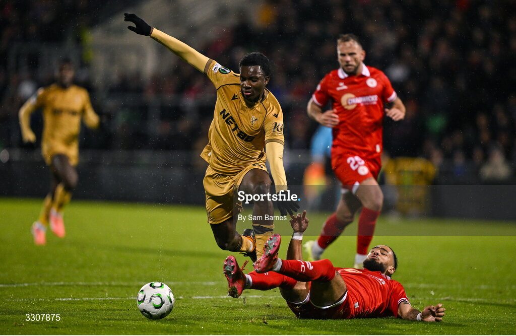 11 December 2025; Eddie Nketiah of Crystal Palace in action against Milan Mbeng of Shelbourne during the UEFA Conference League 2025/26 league phase match between Shelbourne and Crystal Palace at Tallaght Stadium in Dublin. Photo by Sam Barnes/Sportsfile