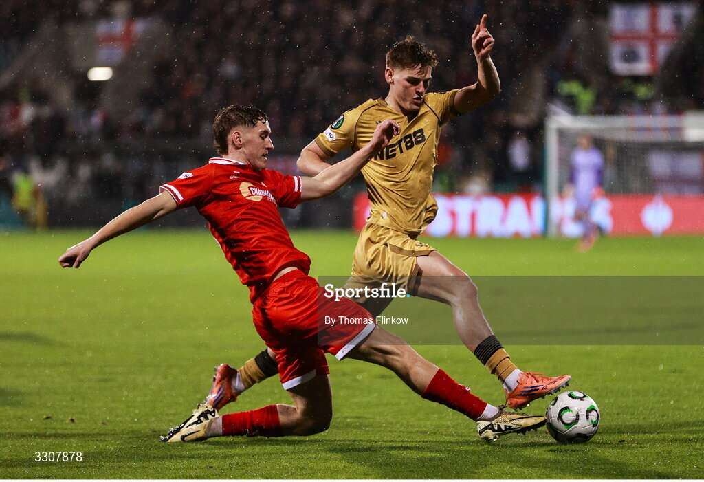 11 December 2025; Justin Devenny of Crystal Palace in action against John Martin of Shelbourne during the UEFA Conference League 2025/26 league phase match between Shelbourne and Crystal Palace at Tallaght Stadium in Dublin. Photo by Thomas Flinkow/Sportsfile