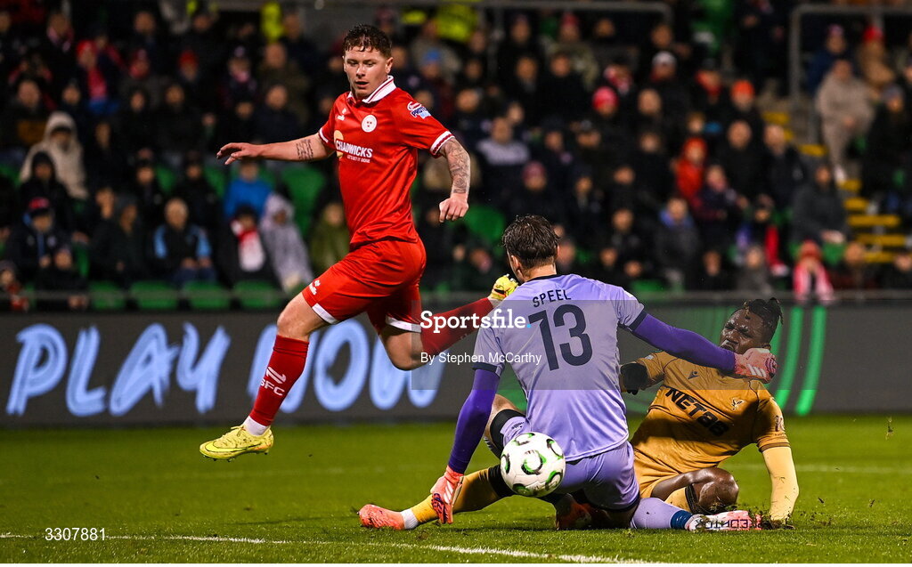 11 December 2025; Christantus Uche of Crystal Palace in action against Shelbourne goalkeeper Wessel Speel during the UEFA Conference League 2025/26 league phase match between Shelbourne and Crystal Palace at Tallaght Stadium in Dublin. Photo by Stephen McCarthy/Sportsfile