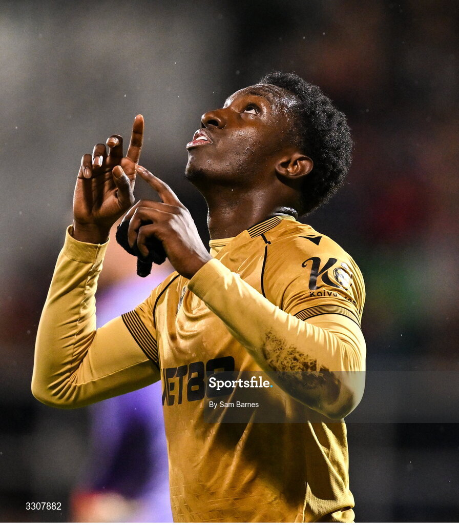 11 December 2025; Eddie Nketiah of Crystal Palace celebrates after scoring his side's second goal during the UEFA Conference League 2025/26 league phase match between Shelbourne and Crystal Palace at Tallaght Stadium in Dublin. Photo by Sam Barnes/Sportsfile