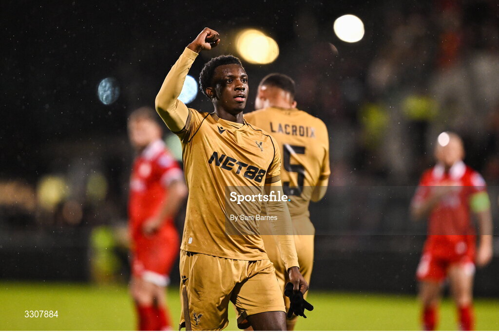 11 December 2025; Eddie Nketiah of Crystal Palace celebrates after scoring his side's second goal during the UEFA Conference League 2025/26 league phase match between Shelbourne and Crystal Palace at Tallaght Stadium in Dublin. Photo by Sam Barnes/Sportsfile