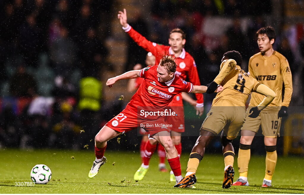 11 December 2025; Jack Henry-Francis of Shelbourne in action against Eddie Nketiah of Crystal Palace during the UEFA Conference League 2025/26 league phase match between Shelbourne and Crystal Palace at Tallaght Stadium in Dublin. Photo by Ben McShane/Sportsfile