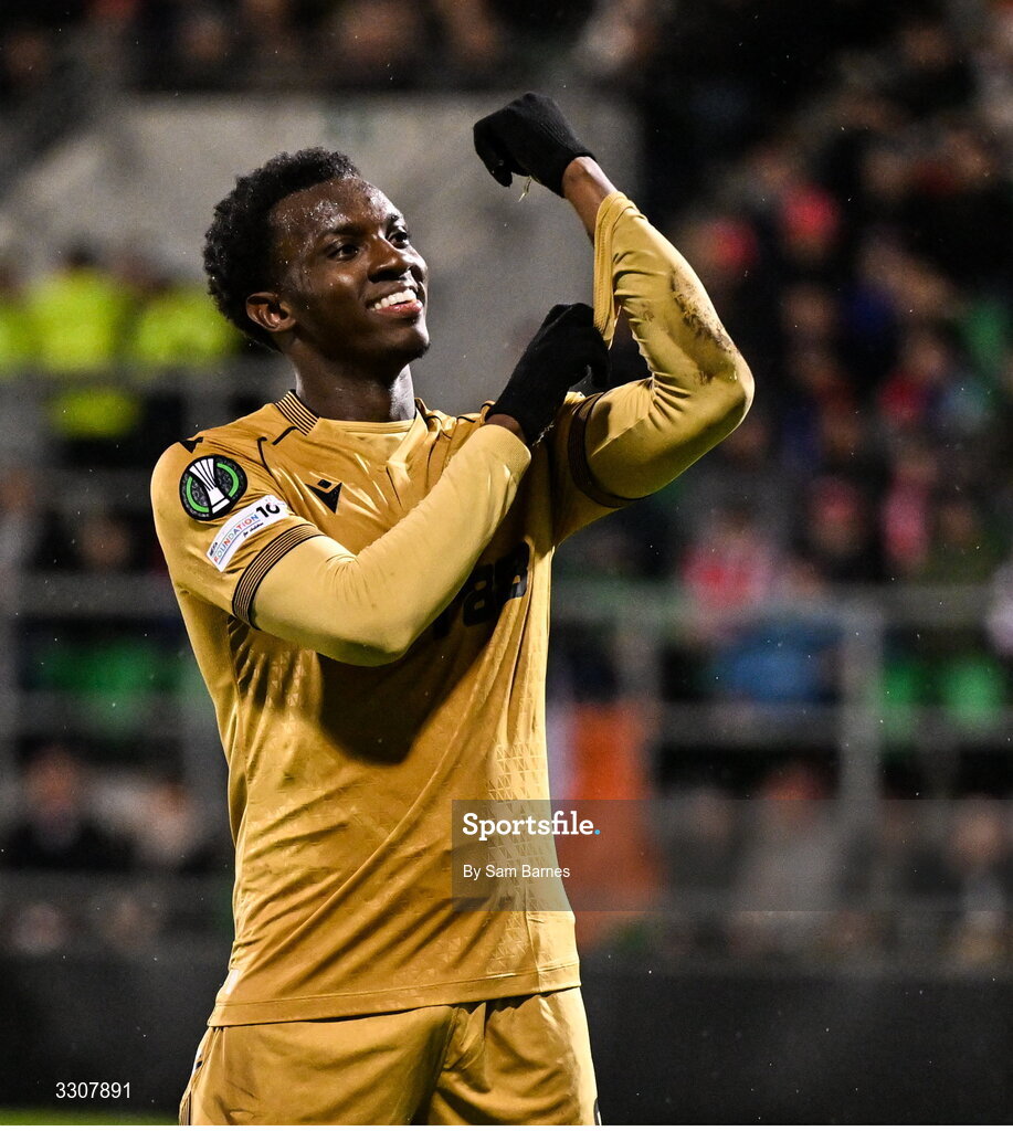11 December 2025; Eddie Nketiah of Crystal Palace celebrates after scoring his side's second goal during the UEFA Conference League 2025/26 league phase match between Shelbourne and Crystal Palace at Tallaght Stadium in Dublin. Photo by Sam Barnes/Sportsfile
