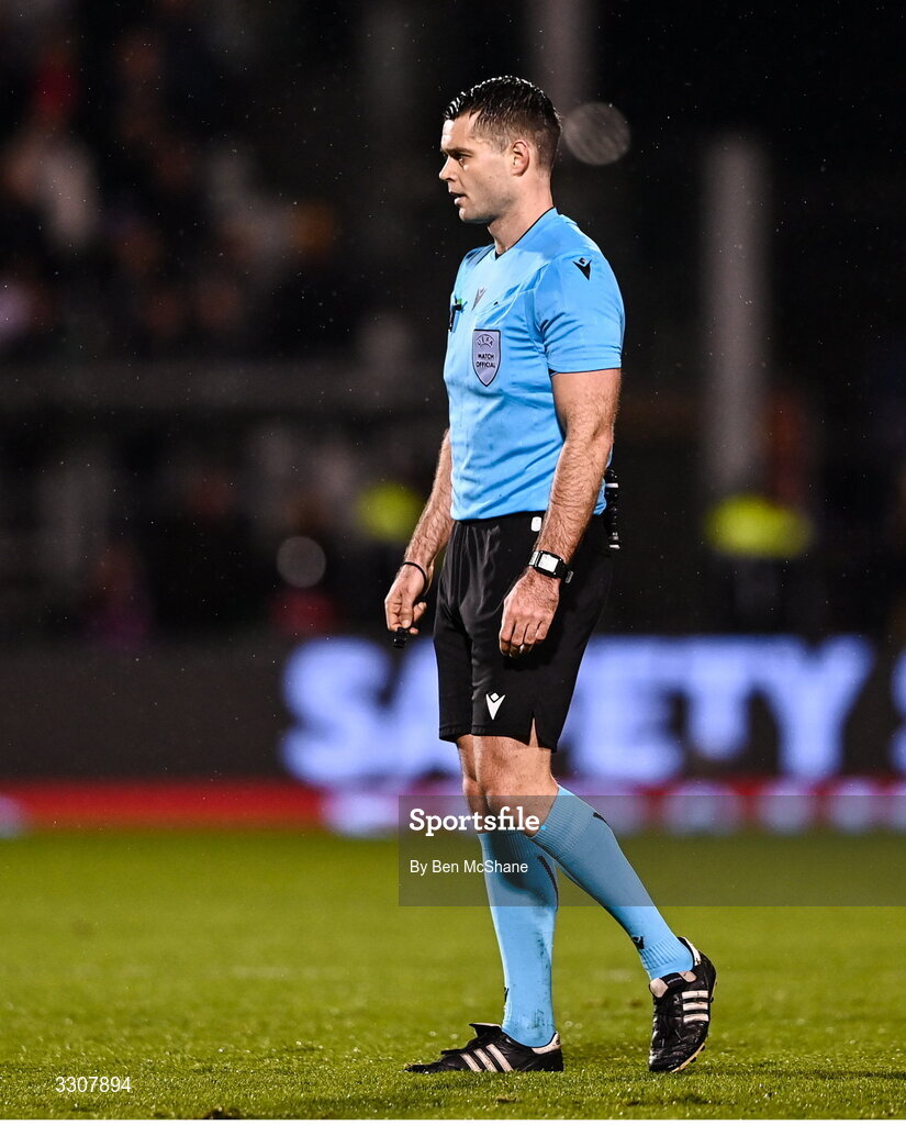 11 December 2025; Referee Martin Matoša during the UEFA Conference League 2025/26 league phase match between Shelbourne and Crystal Palace at Tallaght Stadium in Dublin. Photo by Ben McShane/Sportsfile