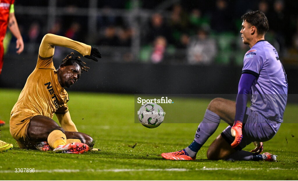11 December 2025; Christantus Uche of Crystal Palace in action against Shelbourne goalkeeper Wessel Speel during the UEFA Conference League 2025/26 league phase match between Shelbourne and Crystal Palace at Tallaght Stadium in Dublin. Photo by Sam Barnes/Sportsfile