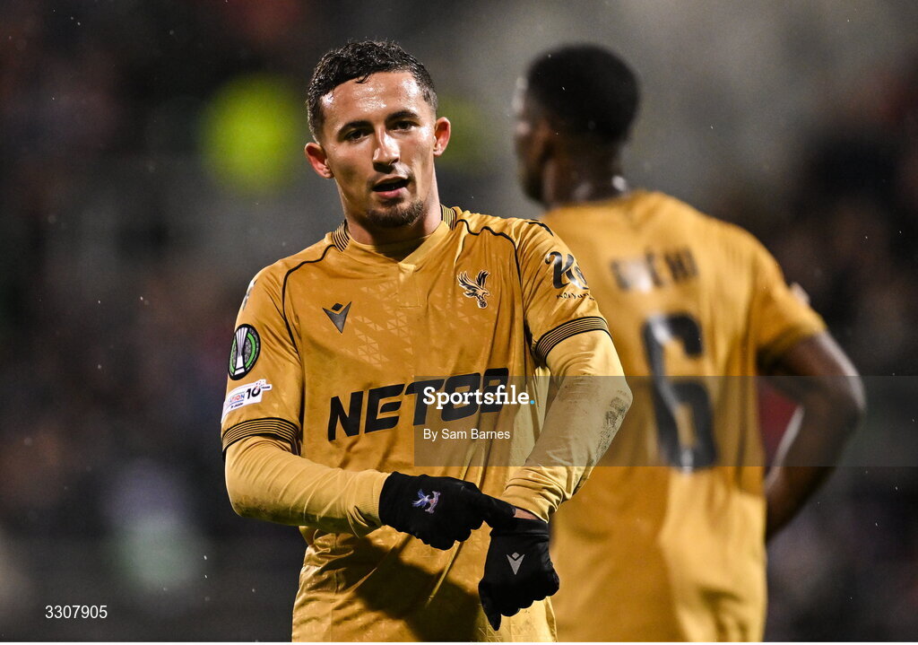 11 December 2025; Yeremy Pino of Crystal Palace celebrates after scoring his side's third goal during the UEFA Conference League 2025/26 league phase match between Shelbourne and Crystal Palace at Tallaght Stadium in Dublin. Photo by Sam Barnes/Sportsfile