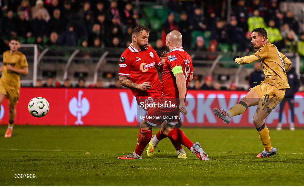 11 December 2025; Yeremy Pino of Crystal Palace shoots to score his side's third goal whilst under pressure from Paddy Barrett, left, and Mark Coyle of Shelbourne during the UEFA Conference League 2025/26 league phase match between Shelbourne and Crystal Palace at Tallaght Stadium in Dublin. Photo by Stephen McCarthy/Sportsfile