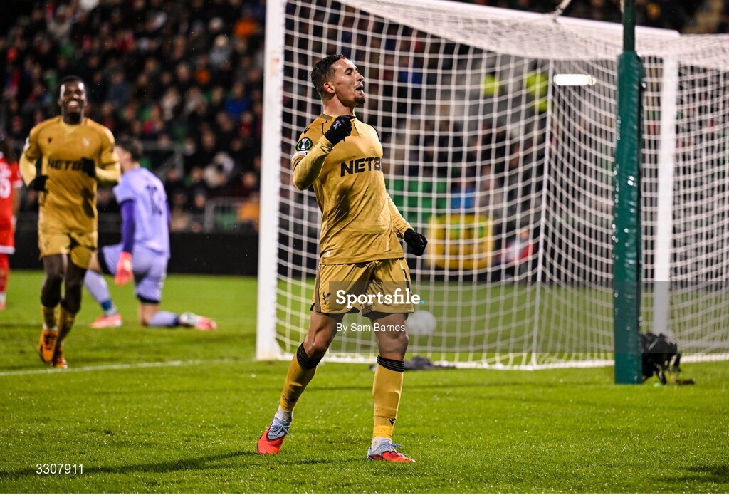 11 December 2025; Yeremy Pino of Crystal Palace celebrates after scoring his side's third goal during the UEFA Conference League 2025/26 league phase match between Shelbourne and Crystal Palace at Tallaght Stadium in Dublin. Photo by Sam Barnes/Sportsfile