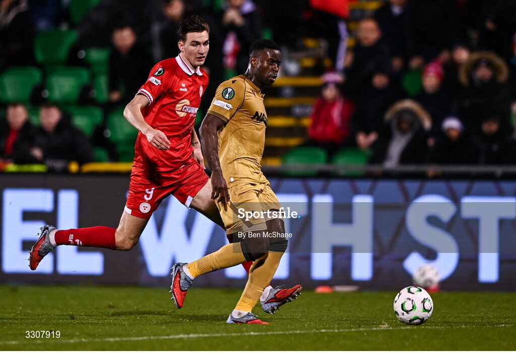 11 December 2025; Sean Boyd of Shelbourne in action against Marc Guéhi of Crystal Palace during the UEFA Conference League 2025/26 league phase match between Shelbourne and Crystal Palace at Tallaght Stadium in Dublin. Photo by Ben McShane/Sportsfile