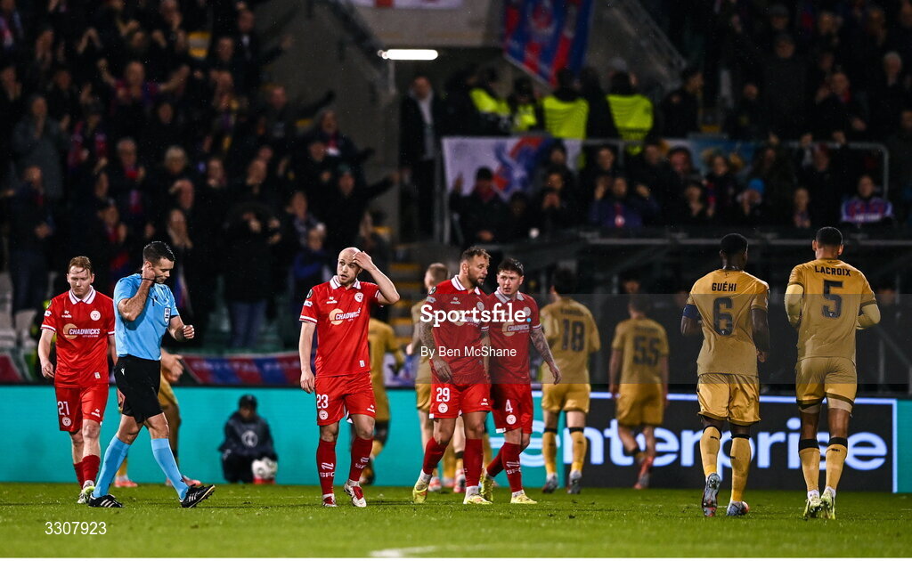 11 December 2025; Shelbourne players, from left, Jack Henry-Francis, Kerr McInroy, Paddy Barrett and Kameron Ledwidge react after their side concede a third goal, scored by Yeremy Pino of Crystal Palace, not pictured, during the UEFA Conference League 2025/26 league phase match between Shelbourne and Crystal Palace at Tallaght Stadium in Dublin. Photo by Ben McShane/Sportsfile